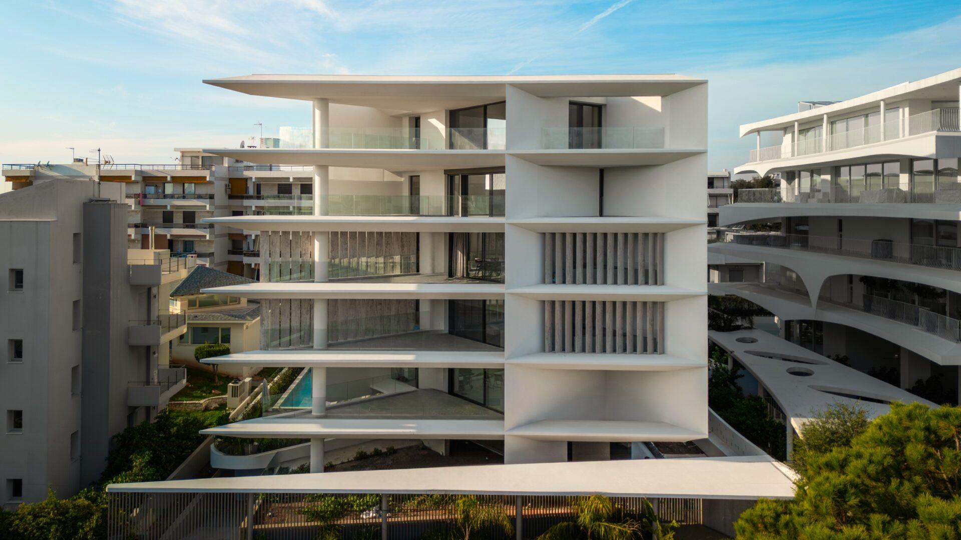 The five-storey building, energy class A++, consists of 11 properties, of which, 2 maisonettes on the ground floor, which have a green area and a swimming pool, 5 apartments on the first, second and third floors and three maisonettes on the fourth floor and an attic. It is located on Posidonos street in Voula, near the beach avenue Karamanli. The location offers direct contact with the sea, which is less than 200m away, while at the same time it has the conditions of a pure residential area. Taking into account the environmental conditions of the area, special emphasis was placed during planning on the application of bioclimatic principles. For this reason, movable blinds are placed on the facade of the building that mark the architectural form of the building while offering shading and privacy at the same time. An additional feature integrated into the design is the water element both in private spaces in the form of a swimming pool, and in public areas of the building as part of the design of the surrounding area improving together with the green surfaces the living conditions in the building.